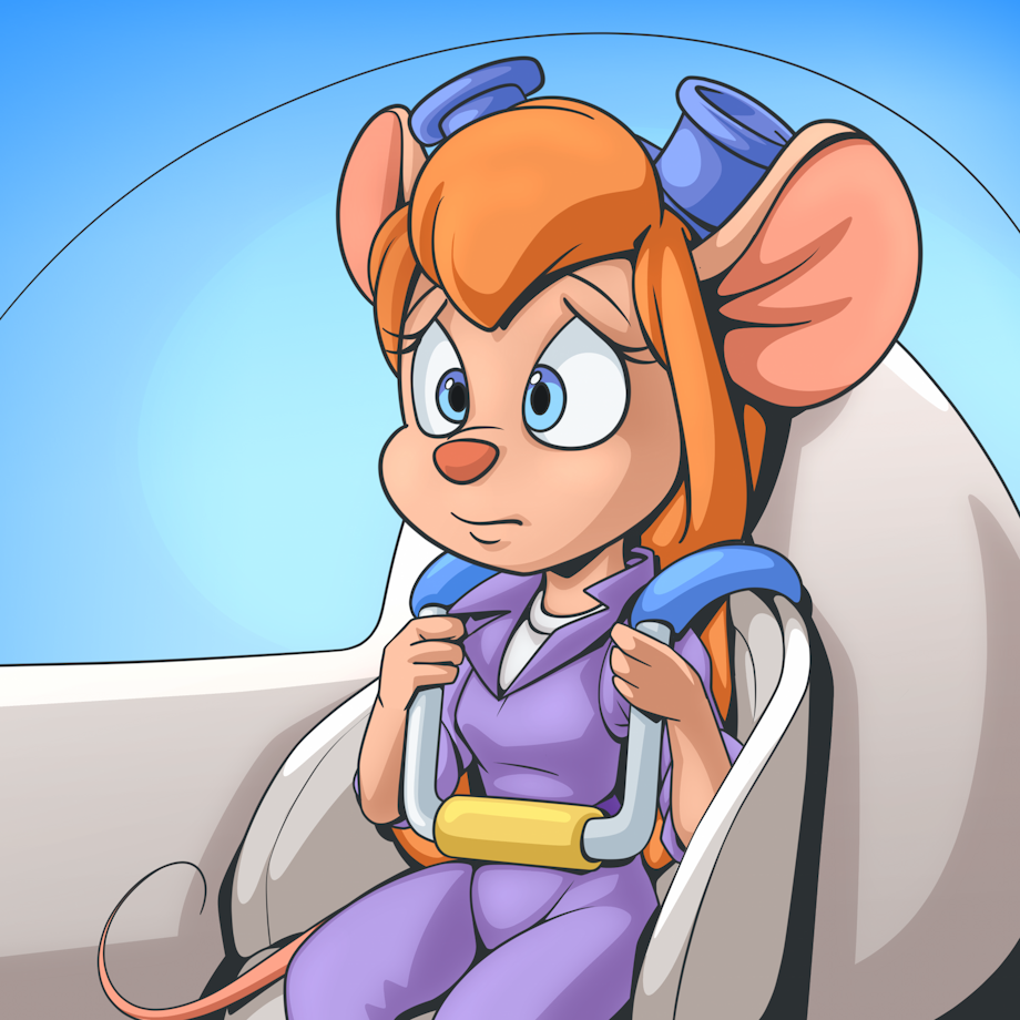 'After Fixing Up An Space Pod, Gadget Hackwrench Is Ready To Get In The Pod To Escape The Spaceship She Was Trapped In, When She Gets Into The Seat Of The Pod She Secure Herself in With A Set Of Over The Shoulder Restraints To Keep Safe, Now A Bit Nervous About Her Situation, Gadget Could Only Clutch Firmly To The Shoulder Restraints She Was In & Hope That She Would Be Ok When The Pod Is Launch Into Space,'