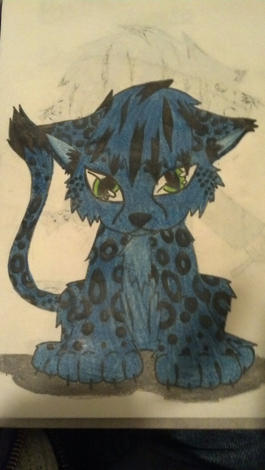 she has dark blue fur with black spots emerald green eyes she has a slim feminine figure with long blue hair with a little black streaks going down