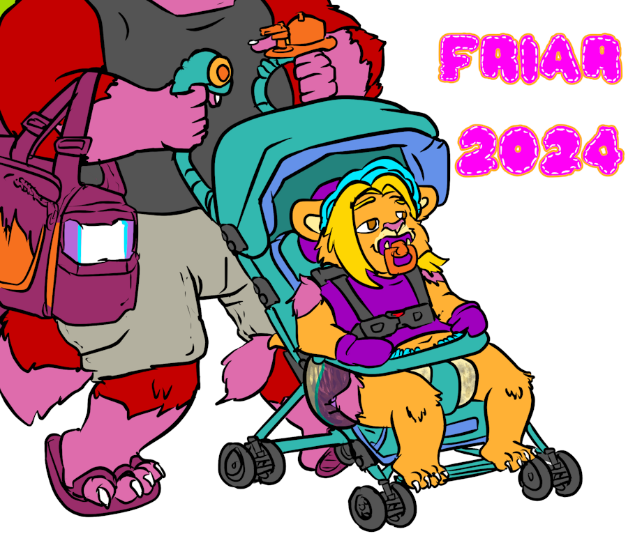 Illustration of Friar the wet and messy diapered lion sucking on a pacifier, wearing a bonnet and mittens, being carted around in a stroller by Berry's dad.