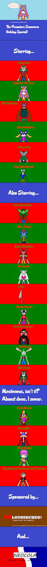 Surprise! I made a full-on holiday special! I know I could have just done that PSA and be done with it, especially since I don't really have any established lore on the Crossfire end of things that lets them interact properly with the rest of the cast or the fact that I had to reset the former JVB-centered timeline to day one, but, I haven't done this in some time and felt like I wanted to make up for the lack of activity since April. So, here we are. Hopefully by the next time I make another one of these, I'll have something a little more coherent to work with. I daresay I made a pretty good effort in getting something out for the holidays, though. I kinda punked out near the end because I ran out of steam. Oh, well, that's life sometimes, I guess. Anyway, thanks for viewing. Happy Holidays! Now if you'll excuse me, I need to consult with a dumb animal character or two on what to do next.