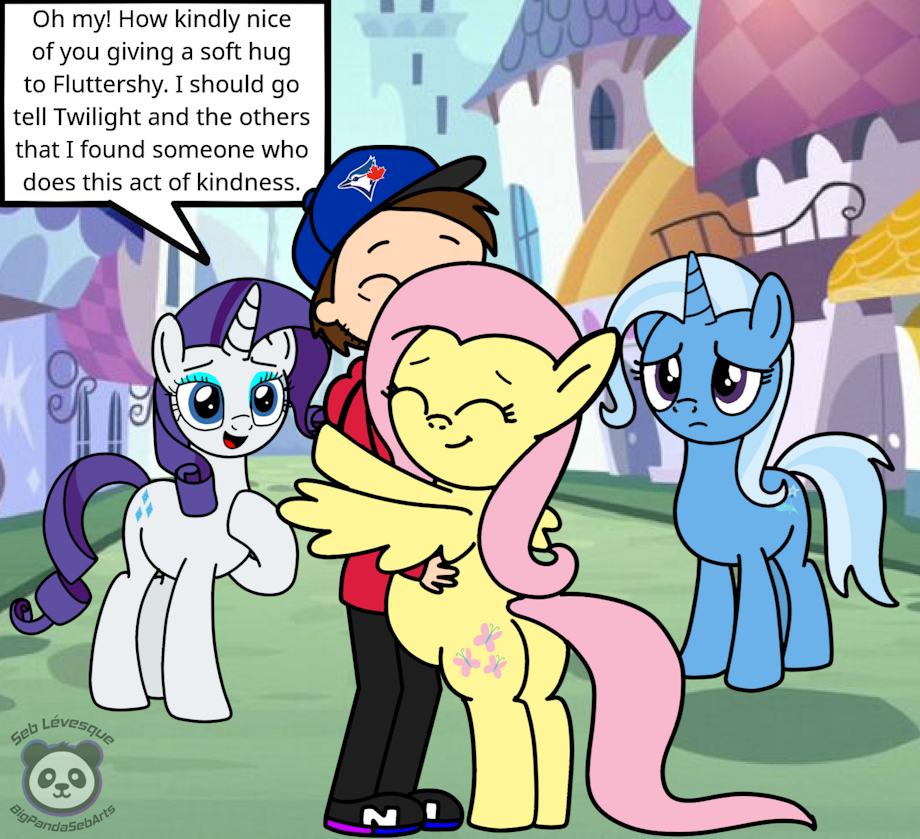 In this scene, we see Mr.S (Seb) doing an act of kindness to Fluttershy: a soft hug. While Rarity and Trixie watches both like they're about to tell everyone that Mr.S is a really nice and popular guy. Except for Trixie, she feels sad seeing me giving Fluttershy a sweet hug on Canterlot Street. _________