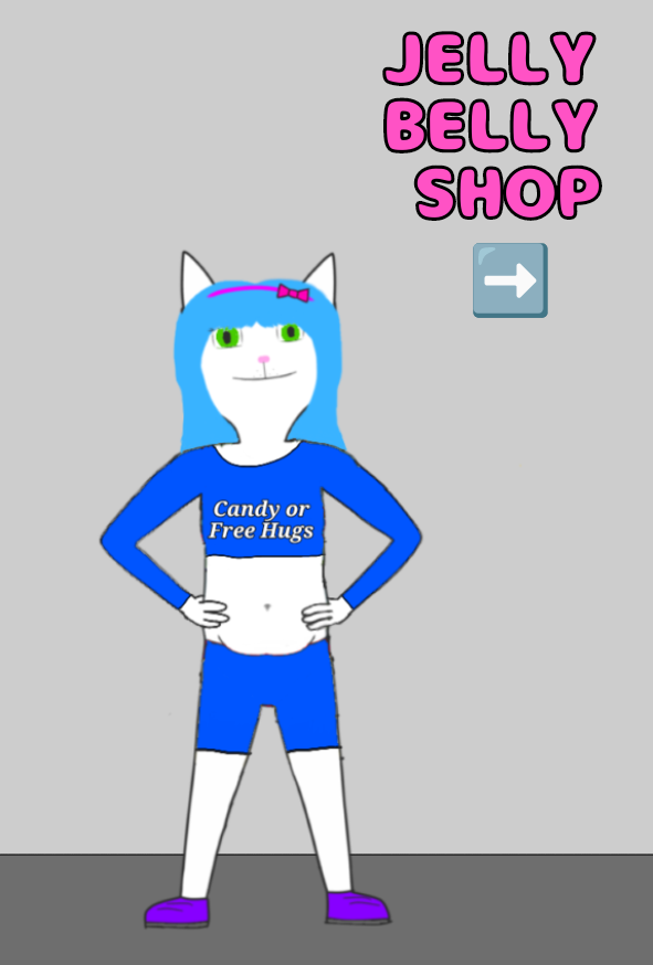 Ellie opens a candy stand at the flea market and gives out candy and free hugs. Notice she's a little chubby.