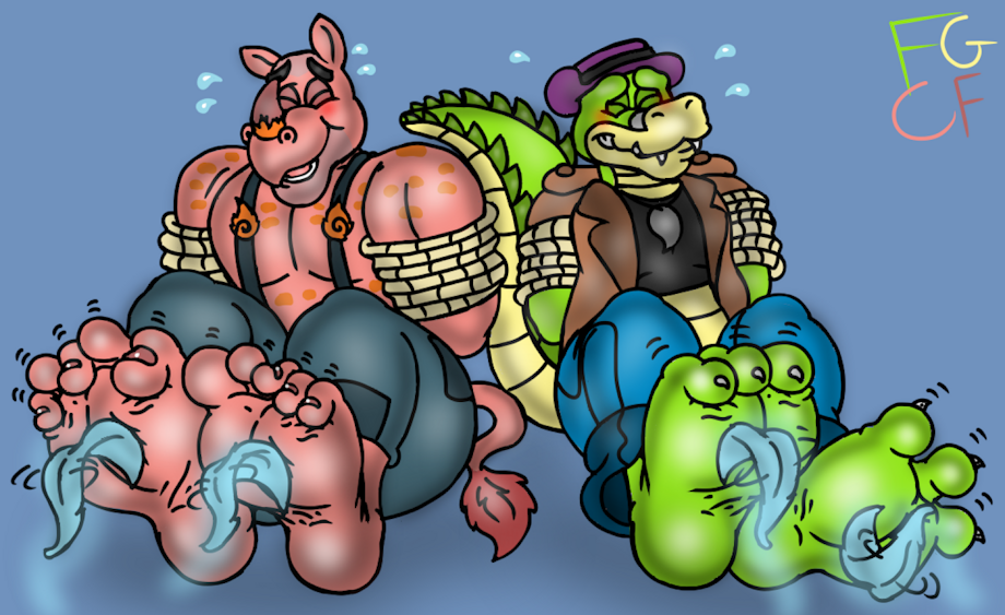 Featuring his Buff Pink Rhino dude n Brok the Alligator all tied up n tickled by some floaty ghostly feathers heh.