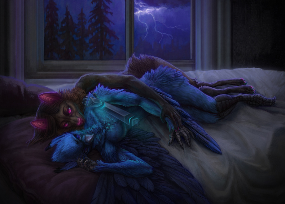 Aaaaa ;v; Cozy cuddles during a storm? Yes please. hurmandurb is an absolutely fantastic artist and is wonderful to work with. Originally we wanted to get some mawshots from them (which turned out fantastic, by the way), but I'd be remiss to not get something.. more in their wheelhouse from them. Something dark and atmospheric, maybe a little moody, where they can flex a bit. And gosh, it's fantastic <3 I definitely want to work with her again in the future some day.