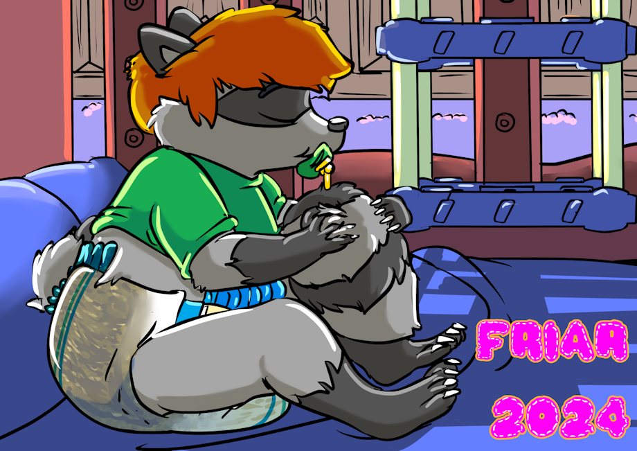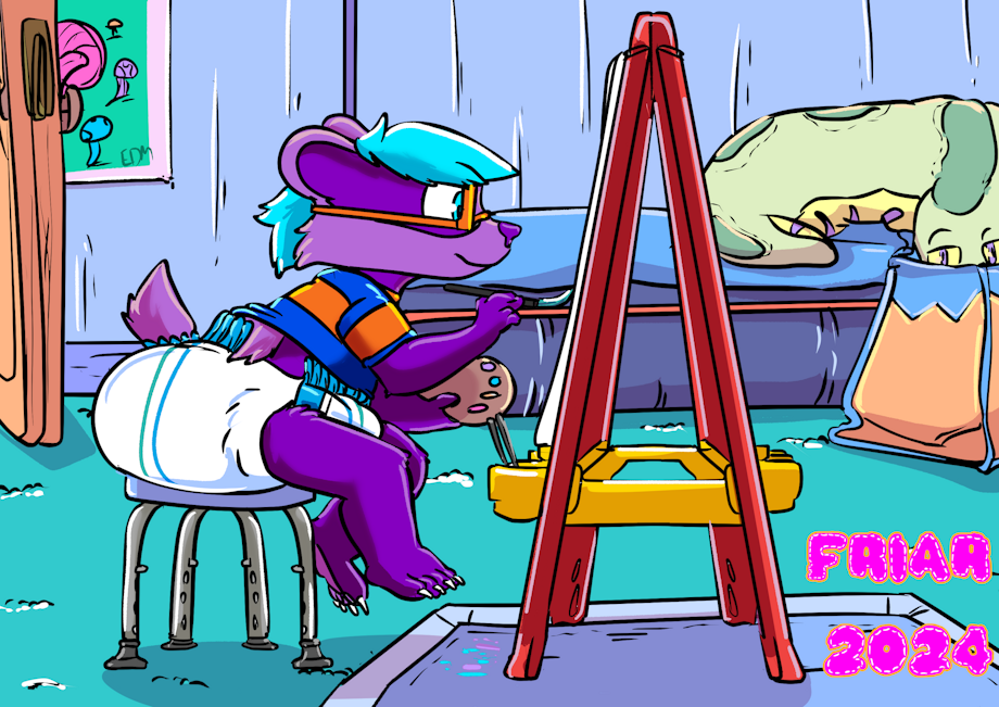 Illustration of Everett the wet and messy diapered badger painting a picture on his drawing easel. A painting of some mushrooms is behind the door, and Everett's snake plushie is on his bed with its nose in a tote bag.