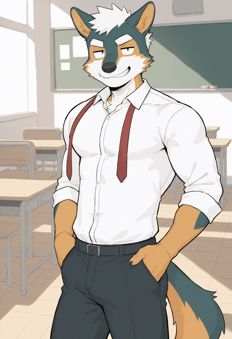 One of my favorite characters is Rook, a wolf who is the protagonist of the doujinshi "Happening at School," created by Canyne Khai. I've been visiting CivitAI for months and looking for open-source models for this character, but without success. What I managed to find, as some of you have already noticed, is "Brown Dog," who makes a special appearance in this same doujinshi.