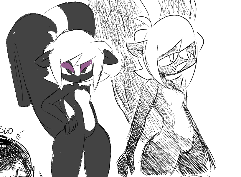 a collection of art featuring our anthro skunk character and her feral rabbit companion