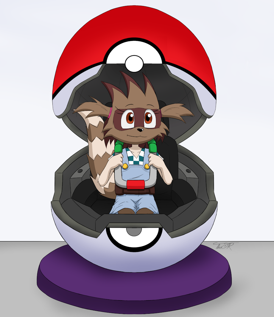 A commission of Flora The Zigzagoon as she is putting on a shoulder restraint as the Pokeball like pod closes in so that she stays safe.