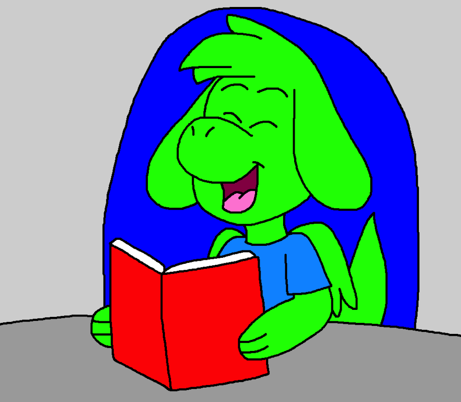 Patch the Dindog Picking a Book in the Library and Go to See Alex and Becky Reading a Book on a Table,