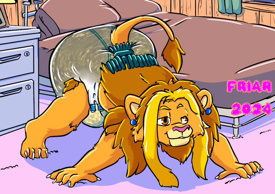 Illustration of Barrett the wet and messy diapered dad lion on all fours in his bedroom.