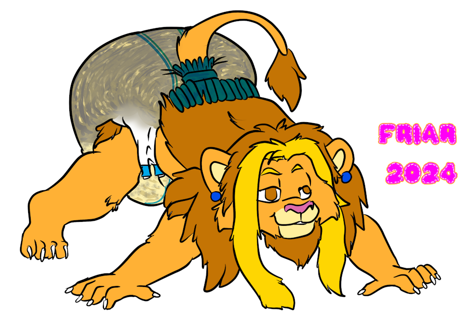 Illustration of Barrett the wet and messy diapered dad lion on all fours in his bedroom.