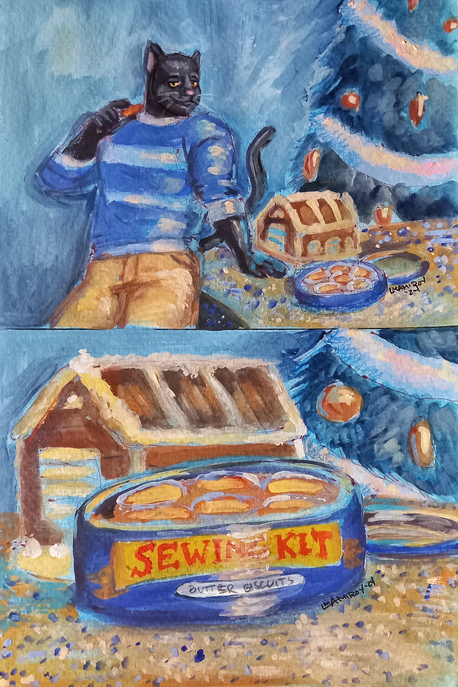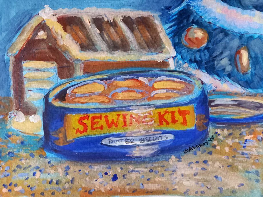 Janus is lucky enough to grab some gingerbread and butter cookies before the boxes turn into sewing kits.
