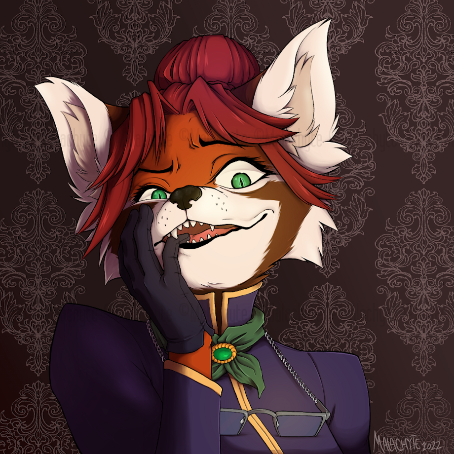 This is my character Ms. Agni (pronounced similarly to "agony" said quickly), who was formerly named Ms. Spixy. She is possibly my favorite of my personal characters, and one that I always delight in refining the design of. I feel like this portrait is the first time I've really nailed her look and gotten it exactly how I want. A bit of a mishmash of red panda and canine, some blatant evil vibes, and hair that makes me reminiscent of Escaflowne. Just looking at this drawing makes me want to draw her more!