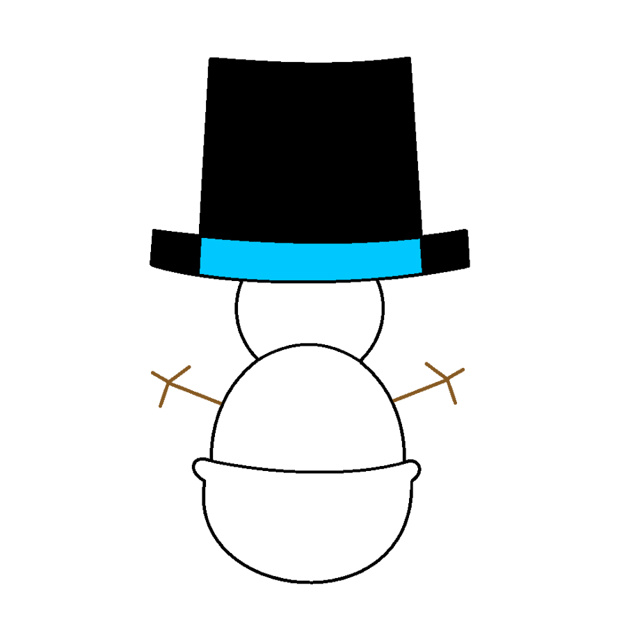 Two snowballs, regular eyes, a carrot-like nose, two sticks for arms with three fingers each, a regular mouth