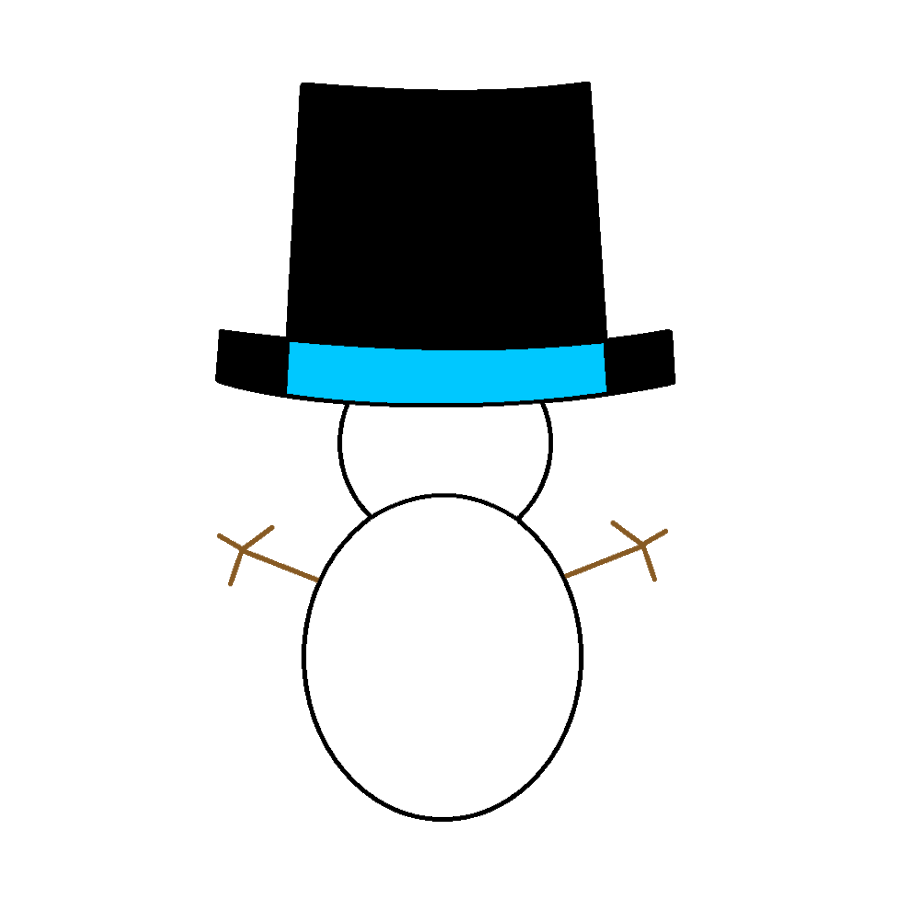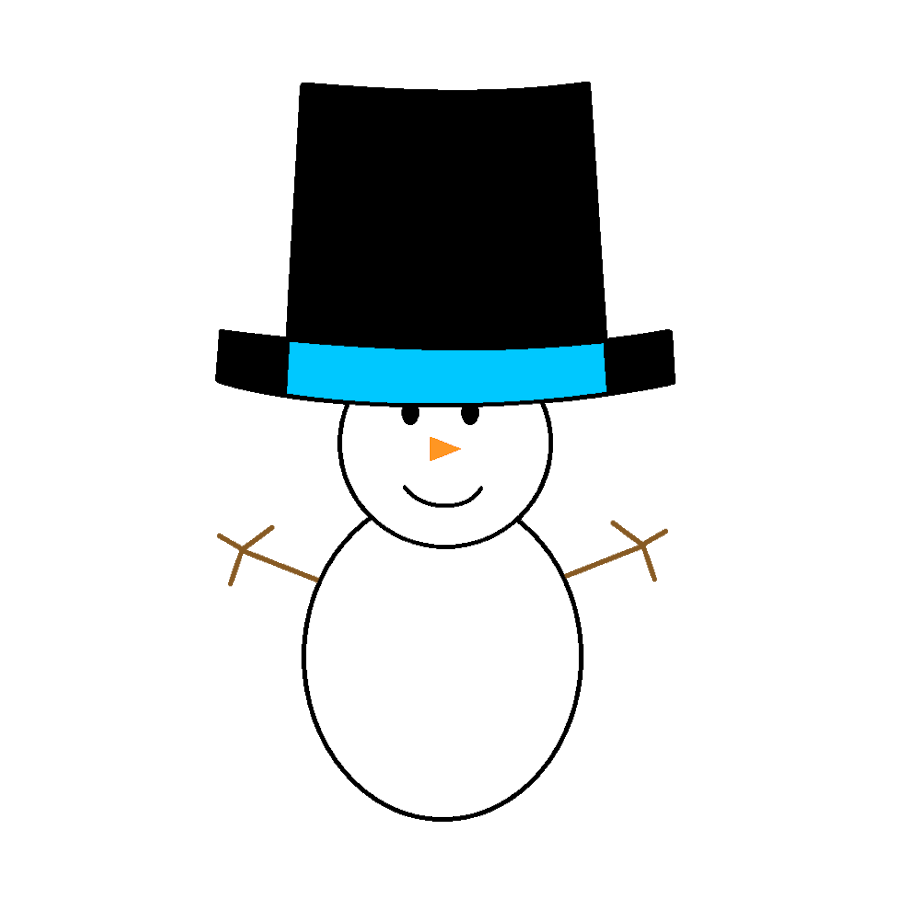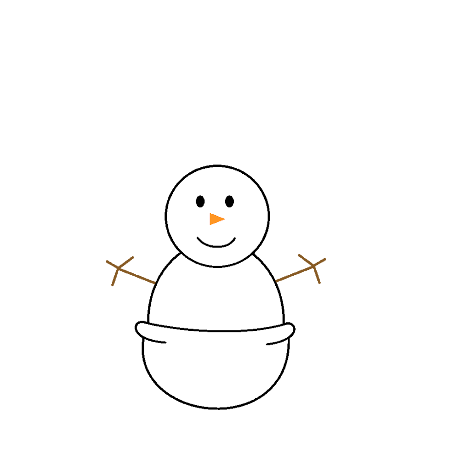 Two snowballs, regular eyes, a carrot-like nose, two sticks for arms with three fingers each, a regular mouth