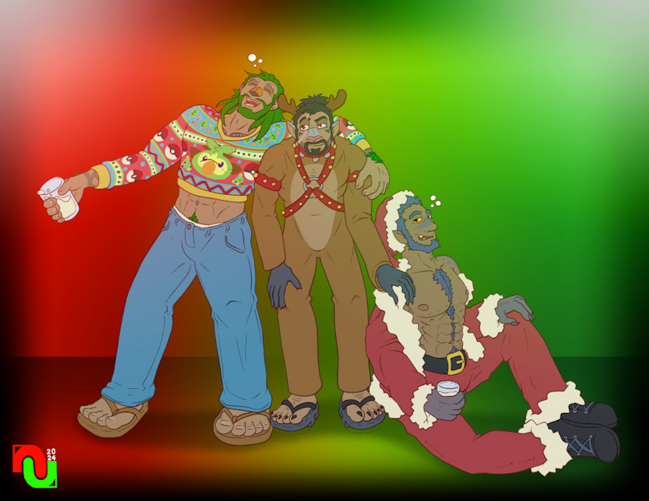 DJ (left) and Rashad (right) have gotten a bit tipsy on eggnog, leaving Yoshiaki (center) to take care of his silly friends.
