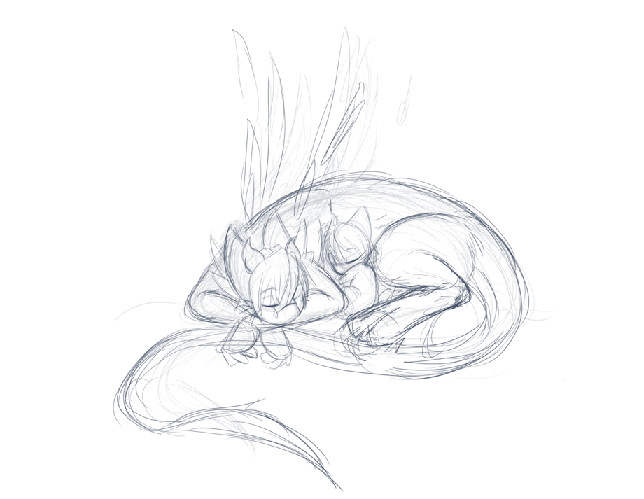 A series of sketches that show Violet with her guardian dragon creature, which she named "Pooch".