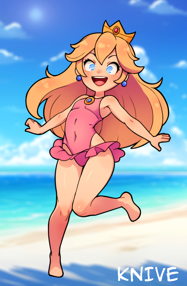 Fanart I made of little Princess Peach on the beach with her frilly tutu swimsuit :)