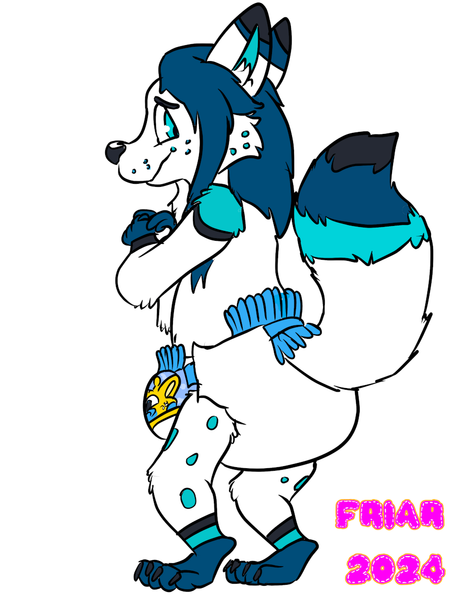 Illustrated commission of Sven the wet and messy diapered arctic fox looking embarrassed while wearing a giraffe print Peekabu diaper.