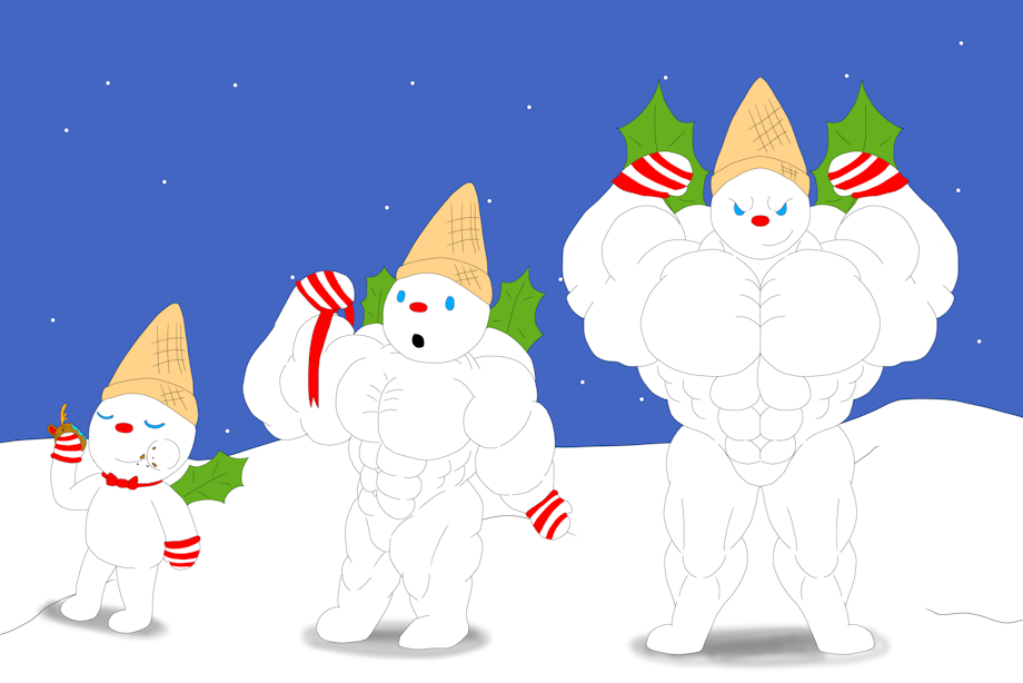If you guys don’t know what Mr Bingle is he is actually my state’s version of frosty the snowman he used to be the mascot of a New Orleans department store going by the name of “Madison Blanche” and now he is the mascot of another department store “Dillards”(even tho dillards isn’t headquartered in my state but Arkansas) also here is a muscle growth sequence of Mr. Bingle