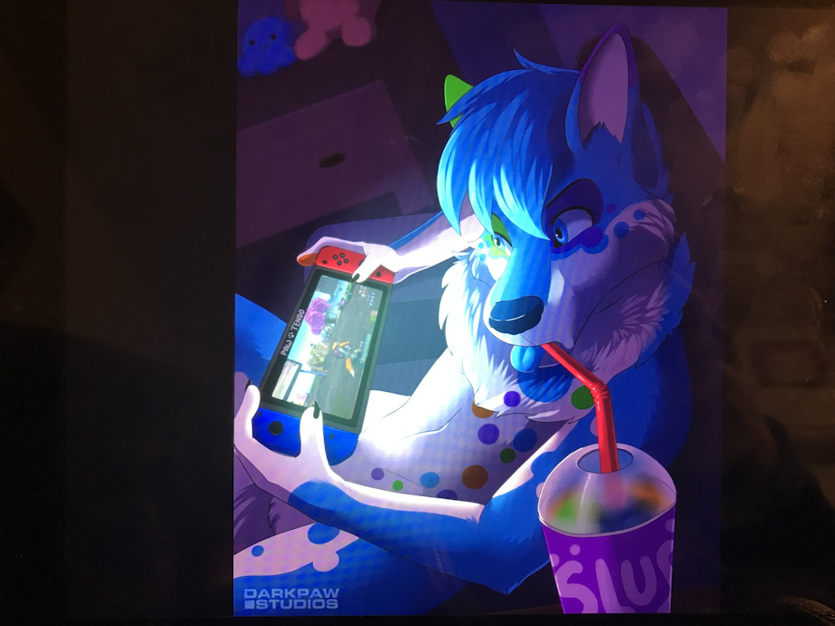Here is a commission I ask darkpaw studios to make for me when I saw them at Vancoufur in March 2023 and I told them I want my character to be drinking a slurpee while playing the pawtendo switch and this is what they made for me and i love it so much.