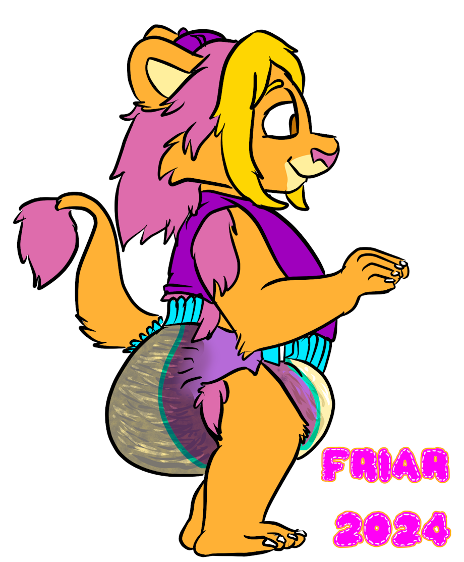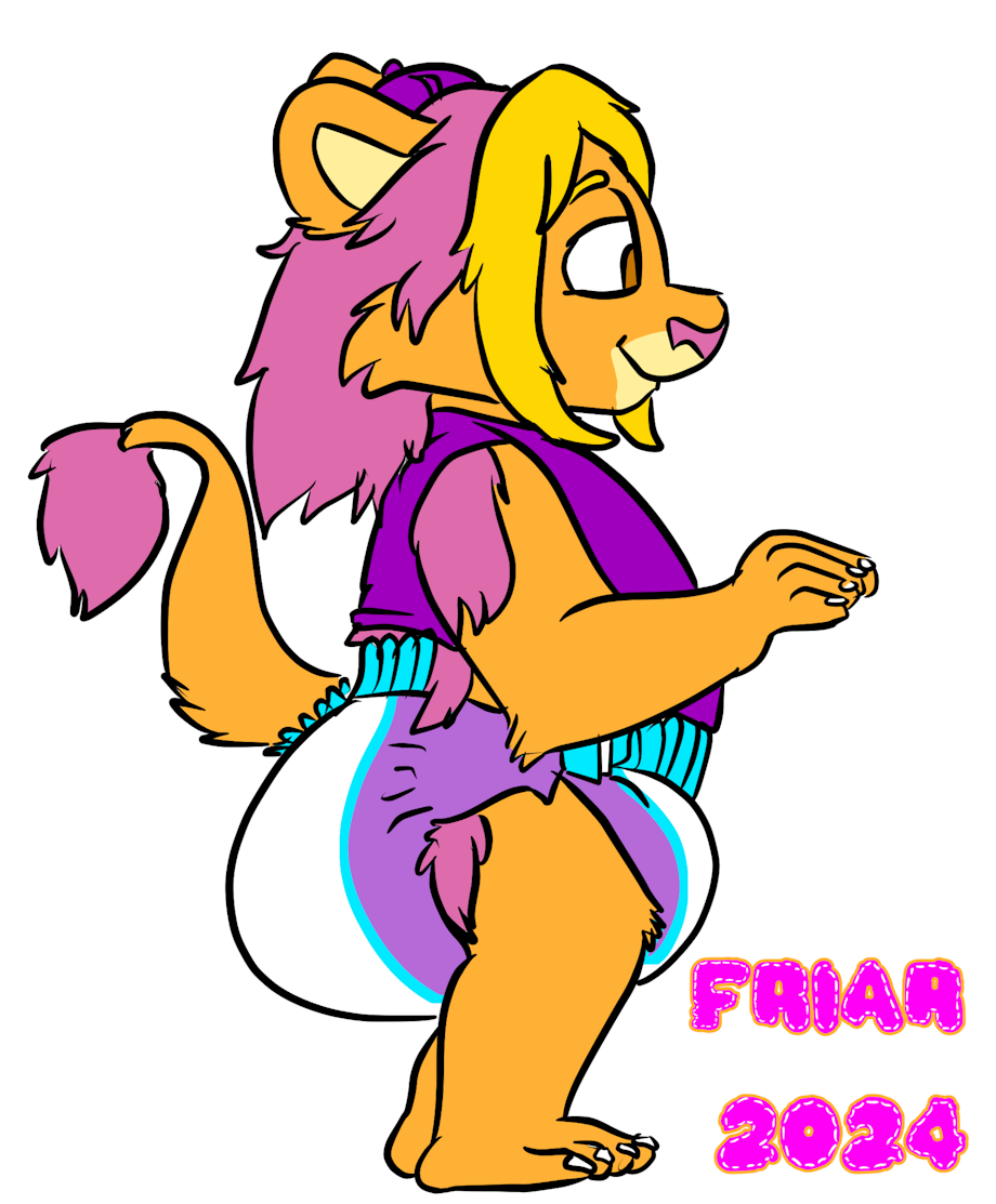 Illustration of Friar the wet and messy diapered lion smiling and enjoying the lights of the t rex menorah on the fourth night of Hanukkah in the treehouse.