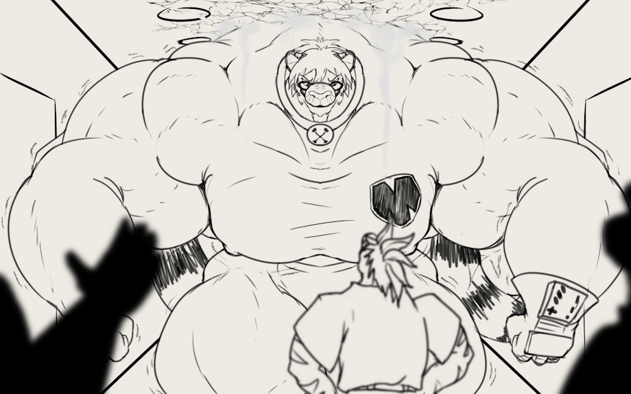 Sketch for TigerClaw. Apparently he got word that someone was running amok in a building he was providing security form. he ended the chase by becoming a wall in the corridor. now this poor, helpless, unprepared intruder has to deal with a giant beefy tiger blocking him in as the rest of security closes in.