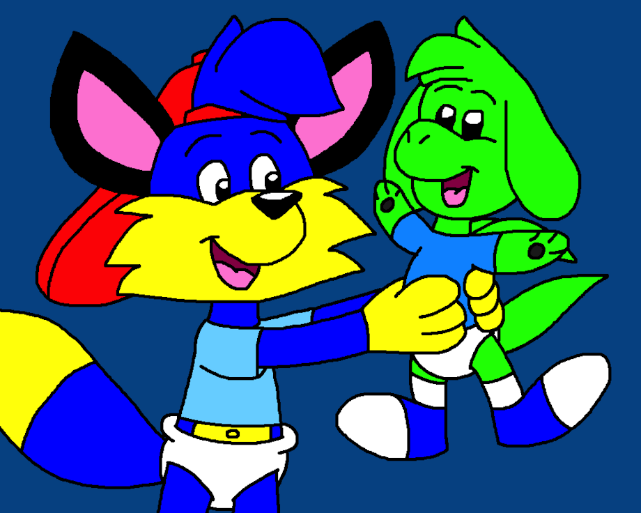 Alex the Fox Holding Up a Patch the Dinodog Doing a Arms Out Pose, and Giving a Big Hug and Cuddle, Just Like That.