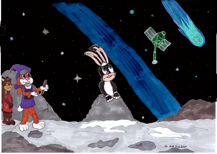 Millie Bunny and her assistant had bewitched Spade onto an asteroid.