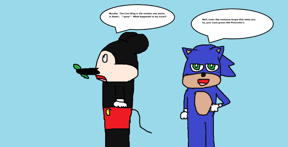 Sonic encounters Mickey Mouse as the iconic mouse's nose is growing from lying about Mufasa: The Lion King being the number one movie in America.