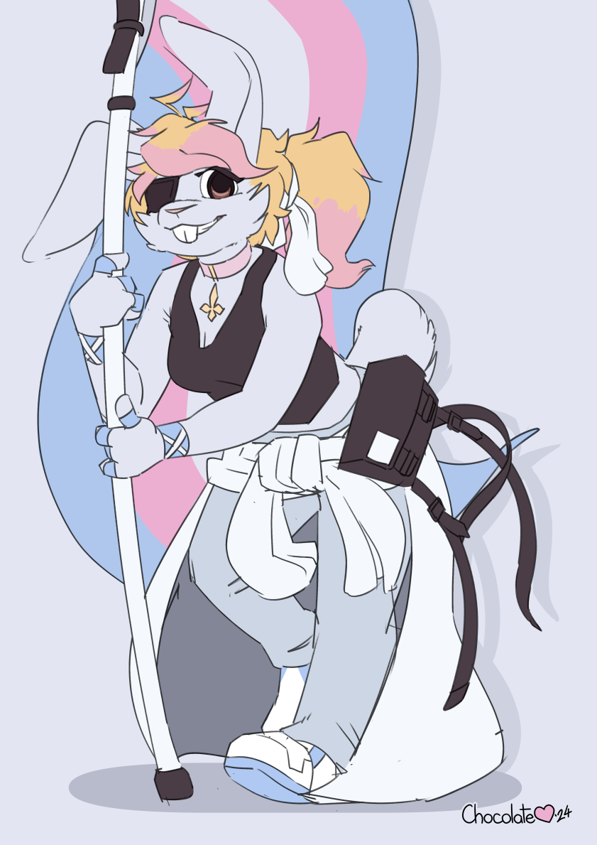 Sin is.. a simple boy, with barely a malicious bone in his body. When referencing his character art I paid special attention to his blank, dumb, but absolutely sincere smile as an important feature to carry over. With how this made me feel, I realized how much "naive bunny idiot wielding a flag" just vibes with me; more than I expected it to.