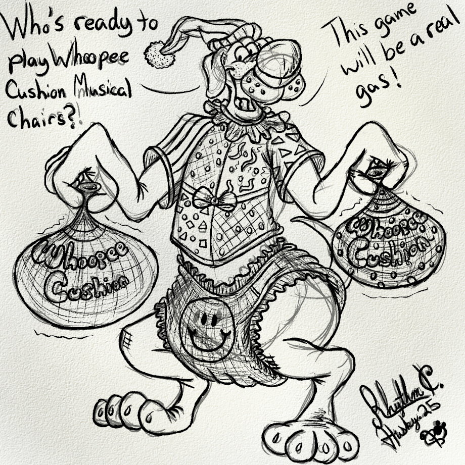 Let's play musical chair but with whoopee cushions this clown dog thought regular muscial chair need to be more silly and so he decide to add whoopee cushions to the seat for a real gas of fun.