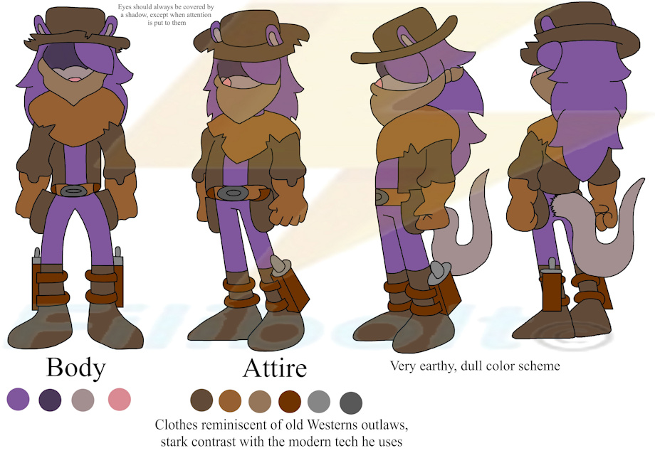 The Phantom Sniper has a tall and lanky, yet imposing, figure. His fur is of a dull purple, his muzzle is dirt-colored with a pink nose and two small ears appears on top of his head. His eyes are always covered by either his long hair or a shadow constantly looming over him, although they seem to appear when he wants to intimidate someone; in that case, he sports creepy acrid green eyes on a black sclera. His mouth is always covered, leading people to suspect that under it might be only be the bones left, or nothing at all. A medium-length tail hangs from behind him which can be used as a whip when in close range.
