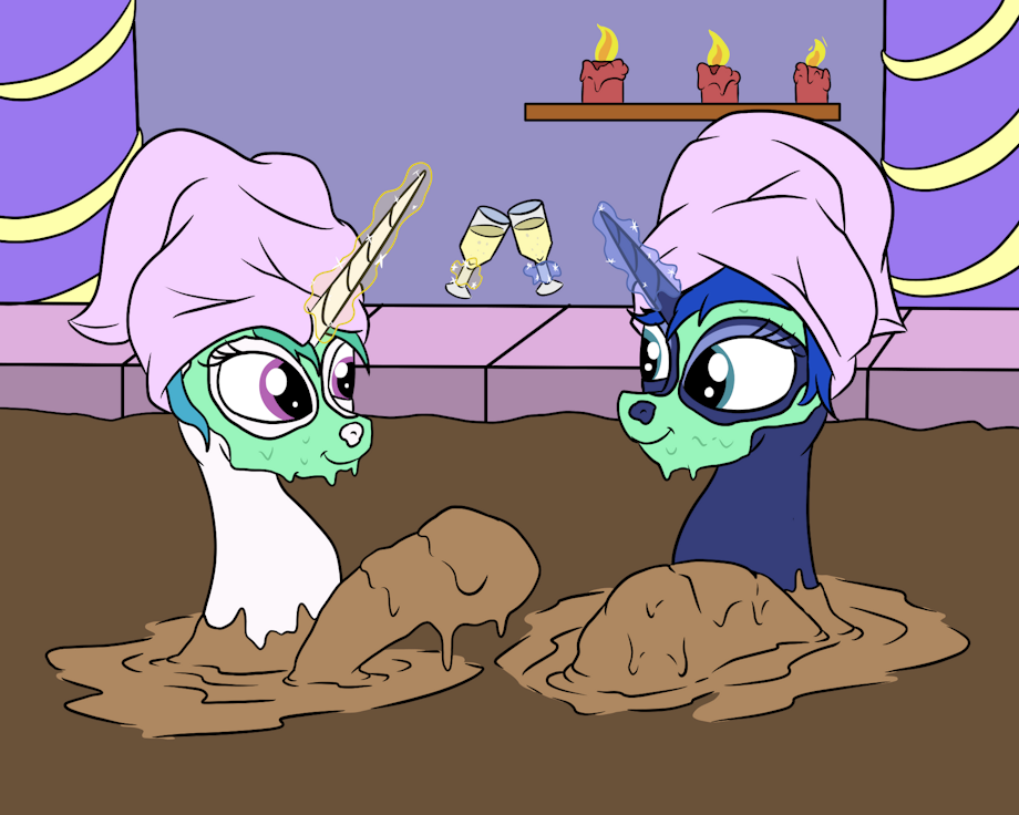 Princess Celestia and Princess Luna enjoying a relaxing time in their own private spa mud bath in their place. Nothing better without a nice glass and mud mask.