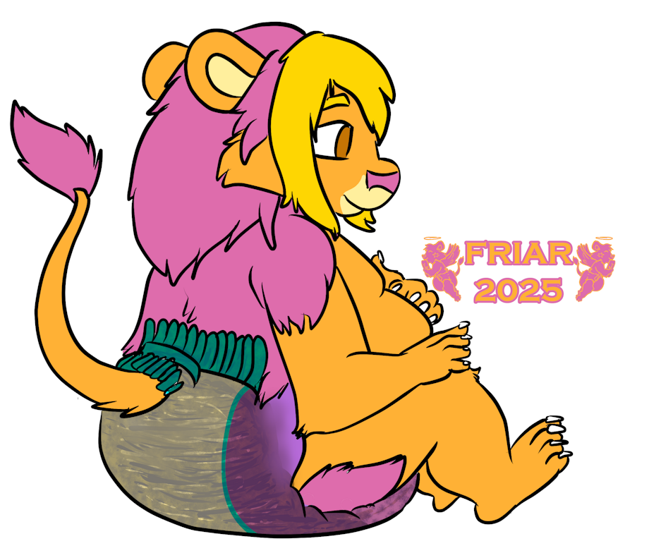 Illustration of Friar the wet and messy diapered lion waking up in the treehouse and rubbing his belly.