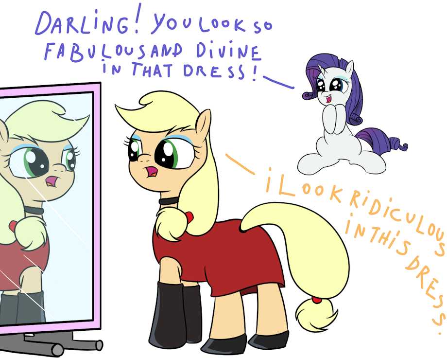 Applejack tries a brand new cute and sexy dress from Rarity. But Applejack isn't really amused with the new dress