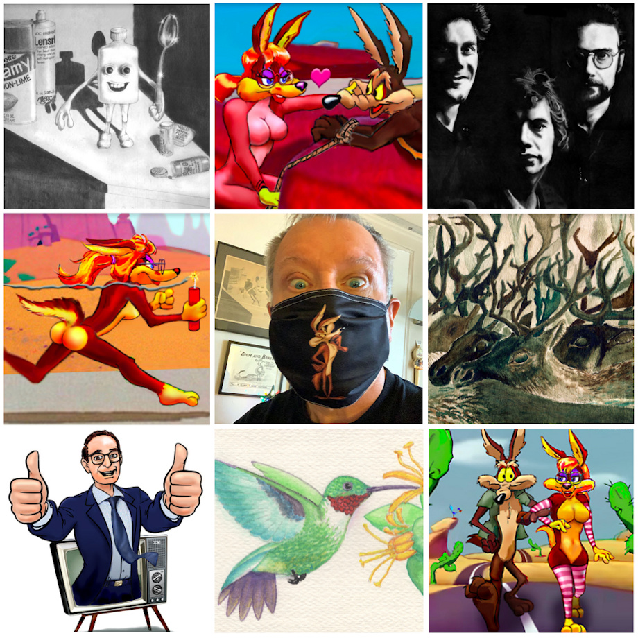 I've noticed some of the site's artists have been posting a sampler of their art via the "Art v. Artist" meme and I thought I would join in, seeing how it felt appropriate for the New Year. Some of these pics (like the King Crimson album art) were done a lon-n-ng time ago, others (like the executive's portrait done when I was temping at Blackstone) are fairly recent. But who is that masked man??