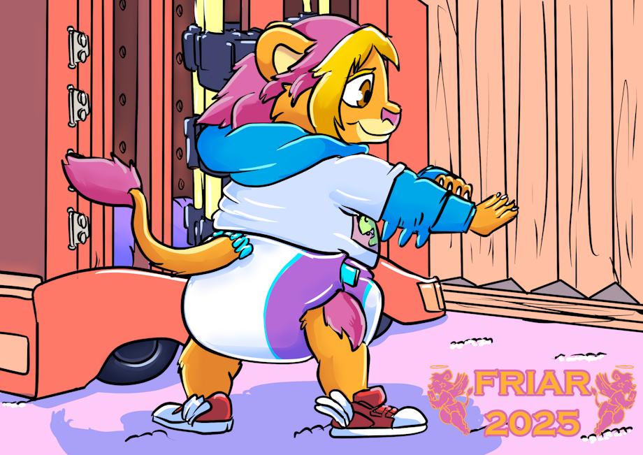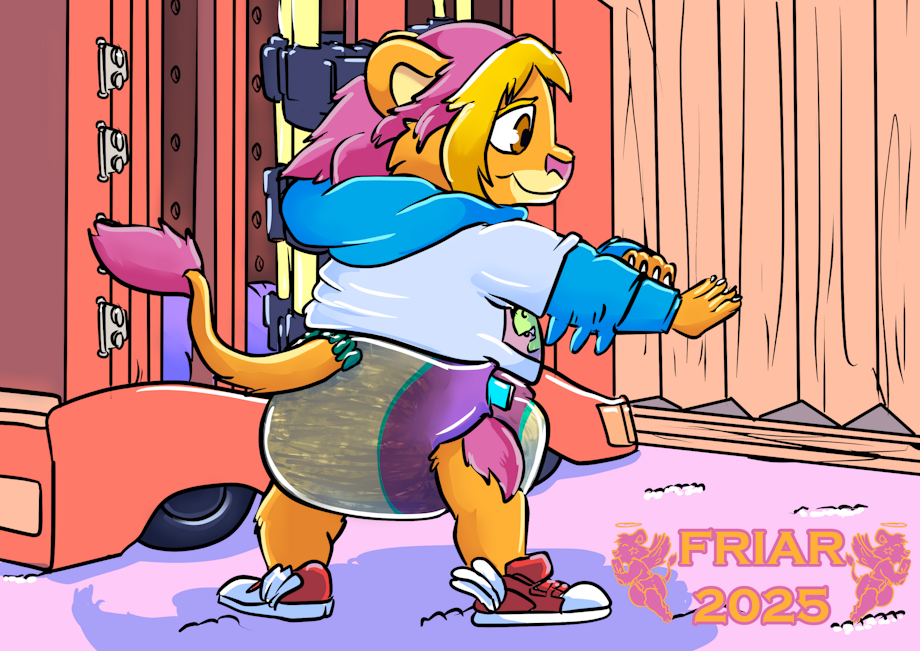 Illustration of Friar the wet and messy diapered lion adjusting the sleeves on a dinosaur themed hoodie with cloth dinosaur spikes on the arms. Friar's laceless shoes have winged flares on the sides and his crib is seen in the background.
