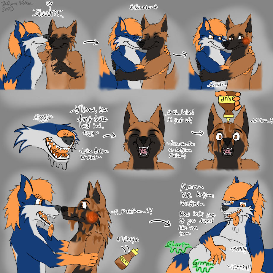 This is a pretty accurate summation of how most conversations between us go. Always starts off so loving and caring. But then quickly devolves to an insatiable desire for me to consume and digest him brutally. Least he's being a good sport about it tough. And he really does taste like Belgian waffles! Isn't that right, doggy? ;3