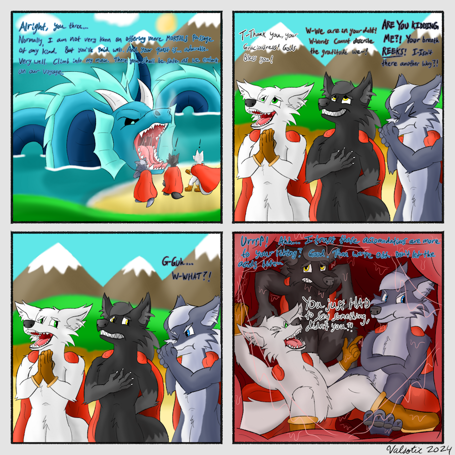 What do you do when you and your friends, a ragtag group of adventurers, need passage through the sea, but a blockade of imperial warships blocks your path? Seek guidance from the helpful local sea dragon of course! Just be careful you choose your words veeeeery carefully around him. One false move can easily get you on his bad side. Much as the third wolf here demonstrates. There's always one in every group, isn't there? x3