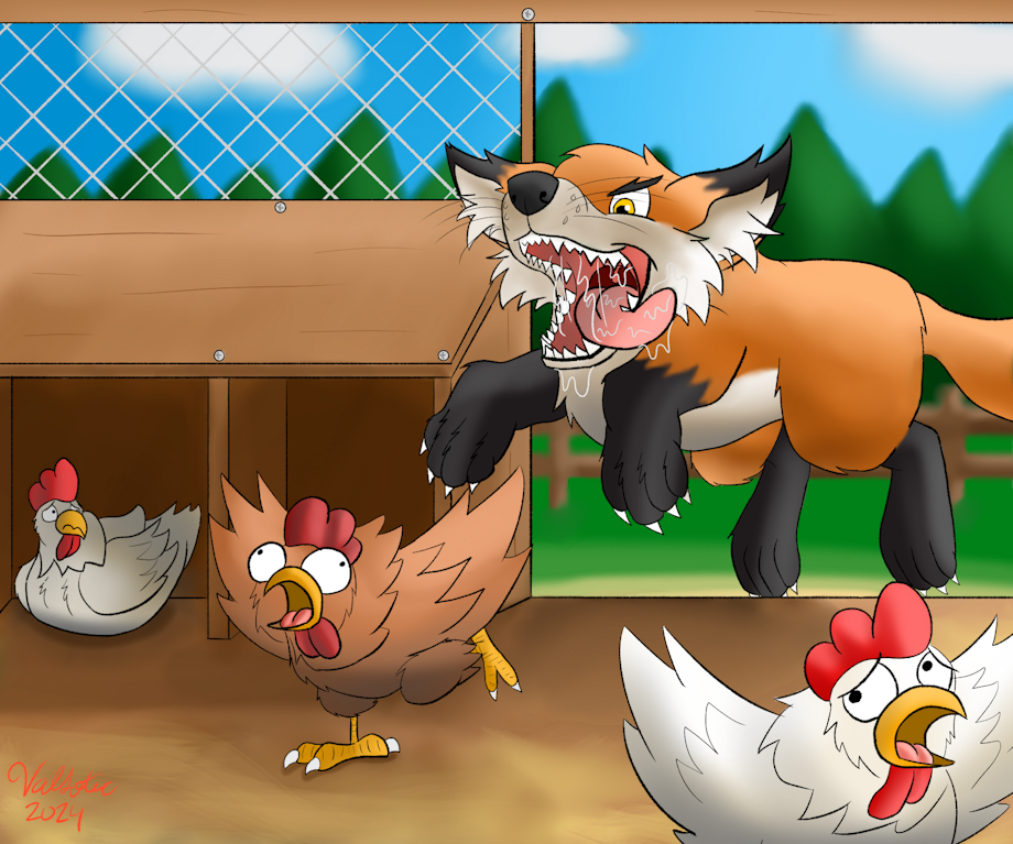 Hehe, anyway! Just a silly, if unoriginal, idea I wanted to draw. I love the fox and chicken dynamic, and I think foxes make great preds in general. I also wanted to get more practice drawing ferals, so here we are! Turned out pretty alright, I'd say. I might consider making a full on story to go along with this at some point, but no promises. Just a silly drawing for now~