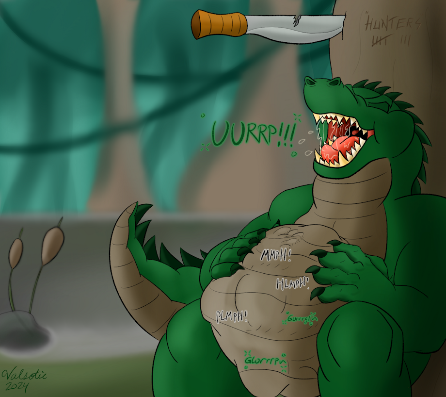 The beast sighed heartily, lying pleasantly against a weathered, great oak tree, moss having long since claimed much of its exterior. It creaked and groaned, and amidst the sounds came more organic ones emanating from the reptile’s swelled, squirming gut. He opened one eye, lazily, and smirked, caressing over the stomach with his broad, powerful alligator paws. Squeezing and scratching, patting and rubbing. All of it serving two purposes: to derive in the reptile the utmost pleasure, and to cement to the poor human trapped within his place in this world. His place… next to this beast. It made him chuckle at the thought, looking to the sword with which the human had tried so valiantly to gut him. He belched again, nonchalantly, picking at his teeth to get out some bits of cloth that got snagged on the way down…