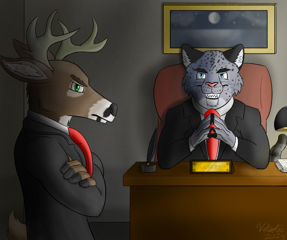 "Wanted to do a drawing depicting Quinone and Saavre, characters from my story "Failed to Uphold." Was inspired to bring them to life after a sweet raccoon friend of mine mentioned to me how much he adored the characters. The more I thought about, the more I realized, I adore them too! They make such a handsome duo: Quinone the deer, the serious assassin and debt collector, and Saavre the snow leopard, the playful "negotiator." Both are brothers, raised alongside one another, though while Saavre is the blood son to the mafia's leader, his own father, also a snow leopard, Quinone was adopted. He was taken in by Saavre's father after he found him alone and scared on the streets, abandoned by his parents many years ago. Through him he was trained in the art of combat and espionage, and now Quinone, along with Saavre, have become invaluable assets to the organization. Beloved members of the family, for sure...