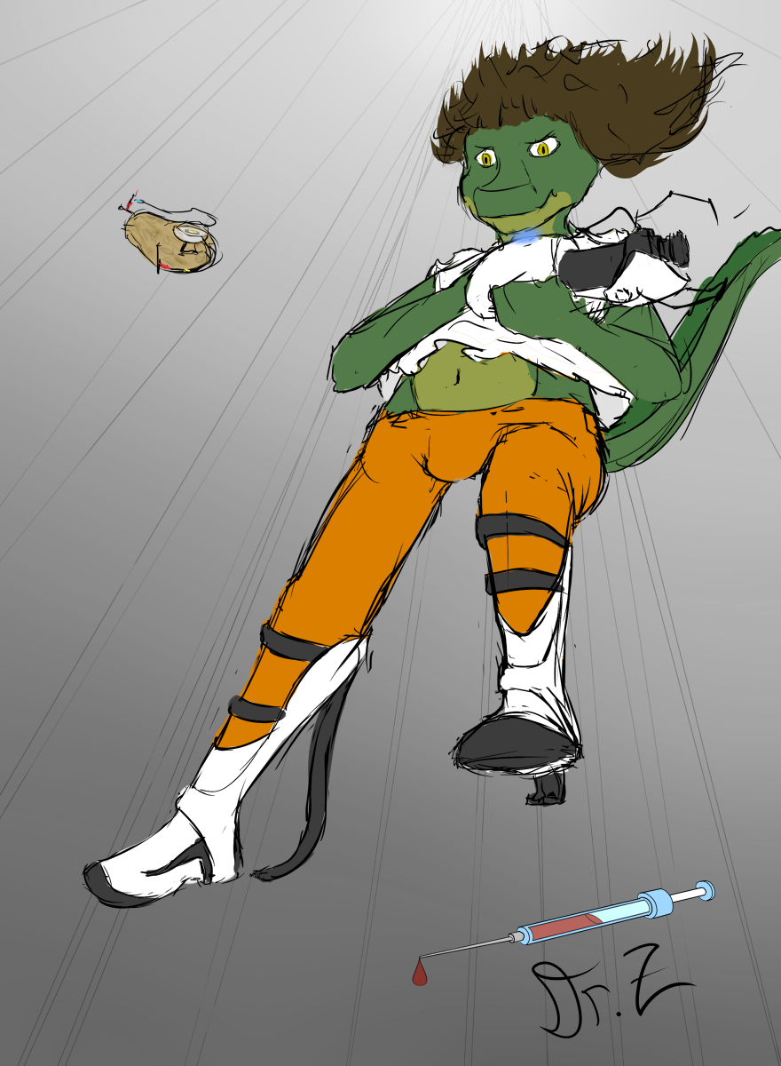 A sketch of Russ plunging into the darkness with potato GLaDOS from Portal 2