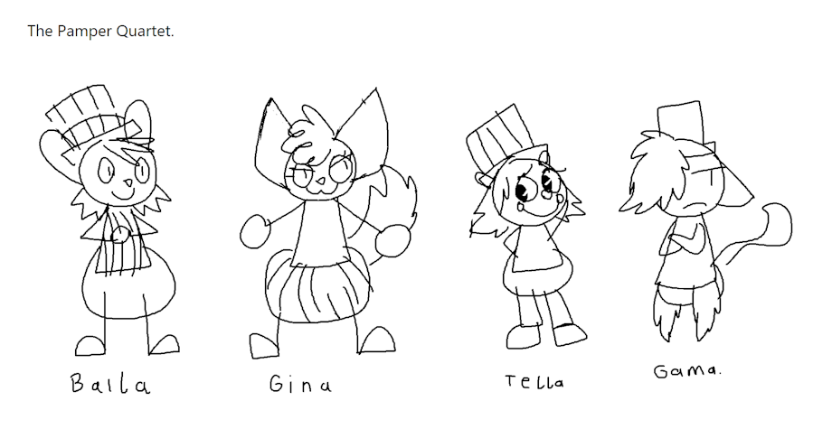 1. Bella, Gina, Tina, and treelo? (i forgot their names) - Possible pamp quartet thing (yes, odd i know) that I thought of. God knows what they might sing. It's probably the first one to include 3 girls, and one "boy". They do not appear everywhere, but I cannot guarantee they'd be in a lot of art ^^; Additionally, I've planned colors for this, but I still want them to be as visually appealing as is on sketch.