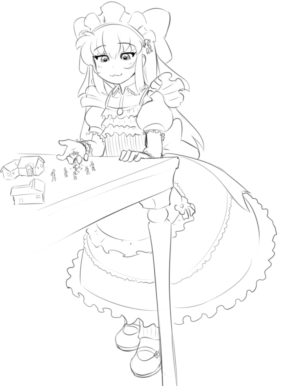 This dress is cute on her, nice mixture of fancy and maidly elements hahah. Also totally princess-y when you're dead tired in the middle of the stream, oops! Adorable handholds and little tabletop model houses too! A fine scale here.
