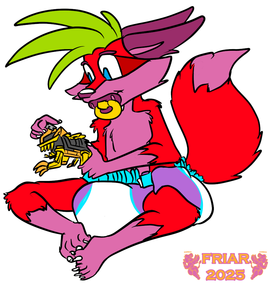 Illustration of Berry the wet and messy diapered fox sucking on a pacifier and sitting next to his bed building a monster mech with building bricks.