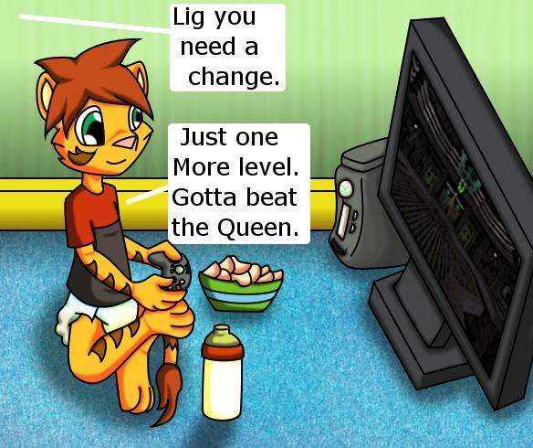 Lig grinned as he sat on the floor with a bottle of milk and a bowl of his favorite chips. Lig had just gotten a new StarTrek game and planned to sit down and play for a while. It'd be a change of pace from Mass Effect. So with that Lig planted himself on the floor with a small flat screen and his game and began to play. Lig was utterly absorbed by his game playing through the first several missions completely obvious as his diaper grew wet and the seat filled and squished. Though Lig might not have noticed the state of his diaper as he played the game Warren did as he walked by nose wrinkling for a moment before adjusting to the smell.