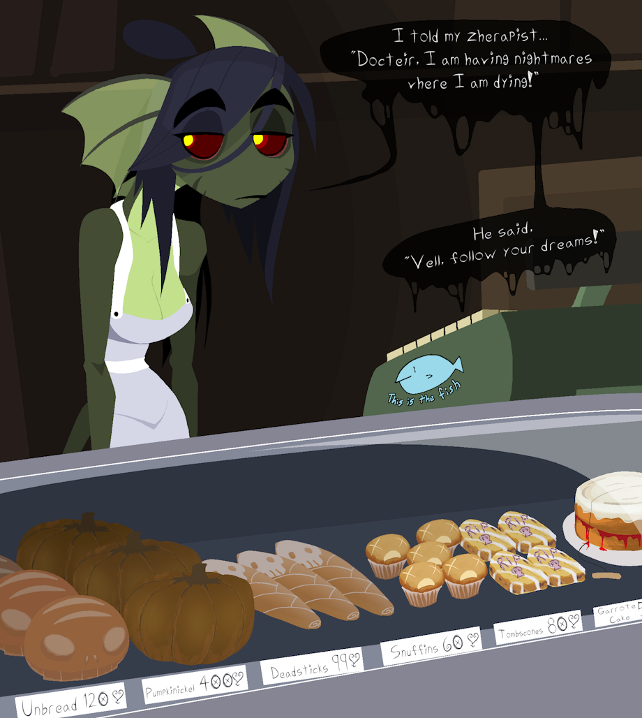 Bogette is a fish lady in my game Melodi. She's just an NPC that runs the bread shop. She makes spooky breads with a dark humor theme, and tells self-destructive jokes like Emo Philips.