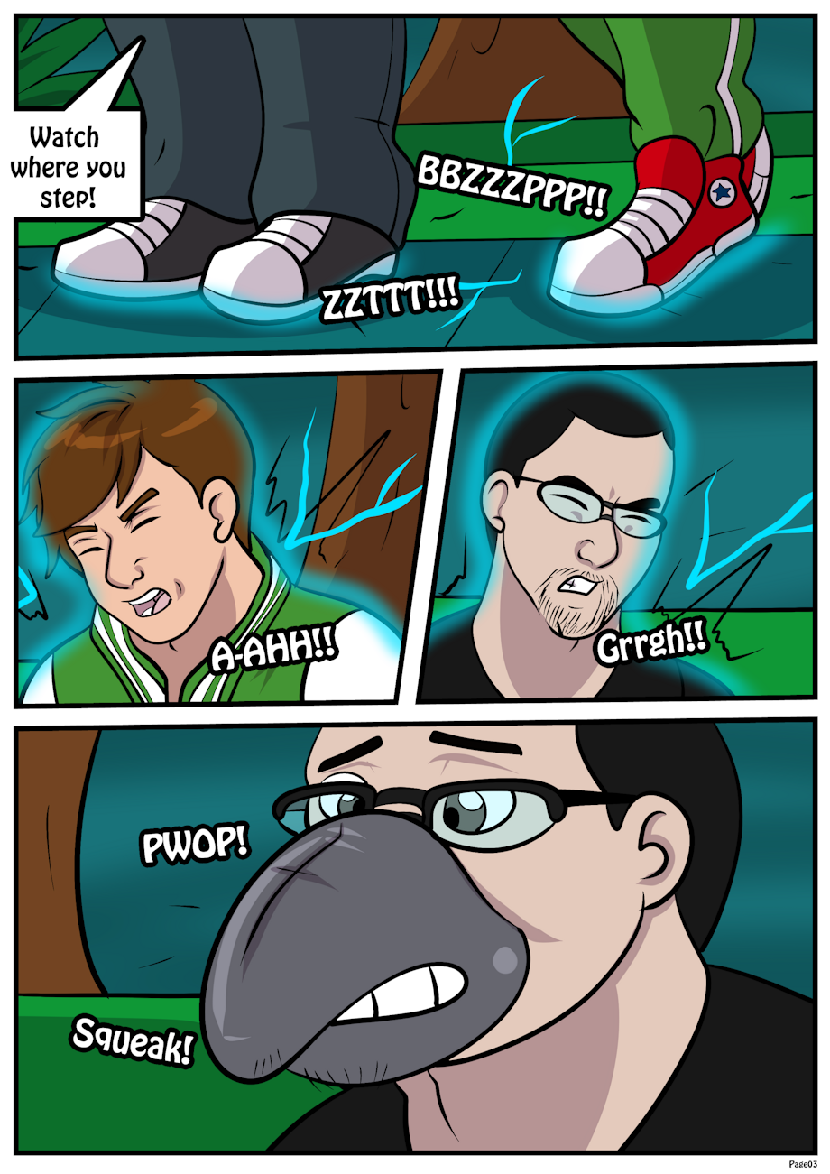 Pyro warned to watch where we stepped, even as he walked right onto an electrified platform, and I followed! Suddenly, we felt a zap through our bodies, and Pyro's face squeaked as a grey inflatable beak burst forth from his face!